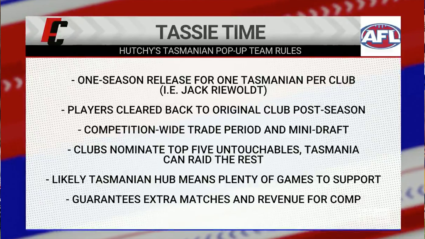 Under Hutchison's proposed Tasmanian pop-up idea, teams will be allowed to nominate five untouchable players with a competition trade period and a mini-draft for all clubs.